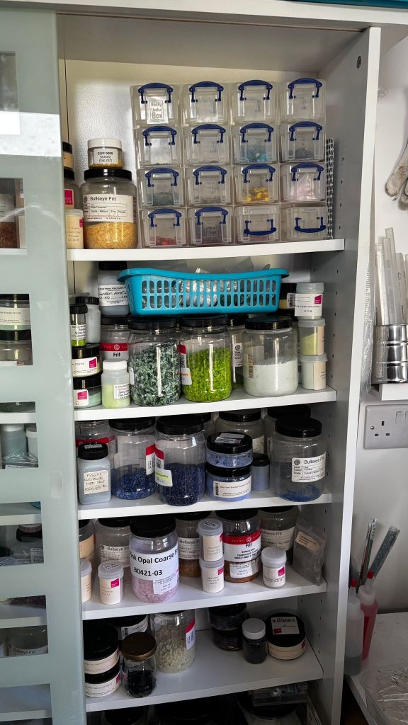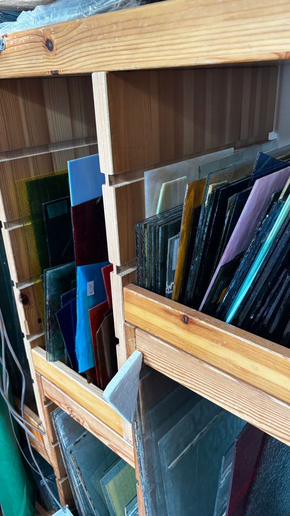 One half is dedicated to stained glass and the other contains my kiln and specialised glass for fusing.